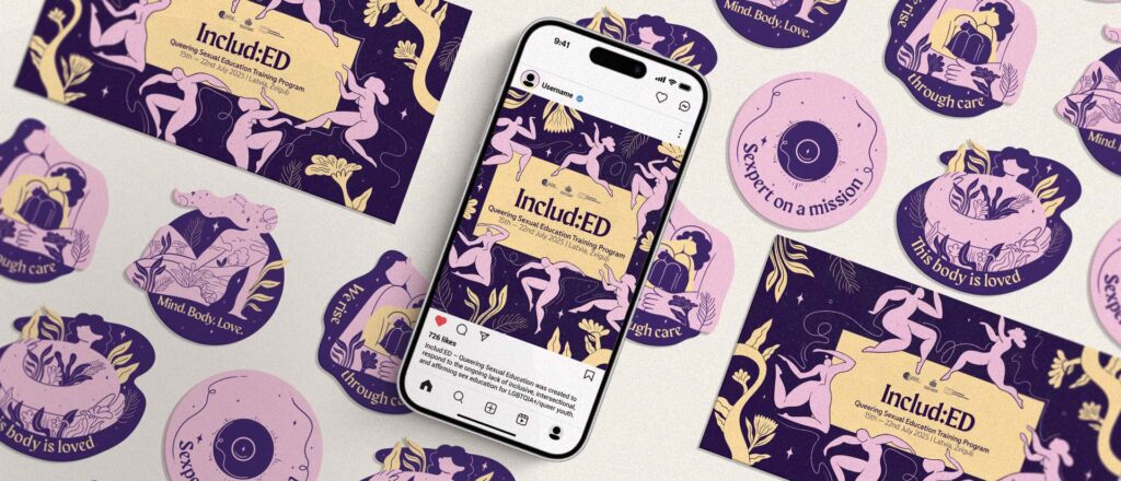A visual identity created for a training program focused on LGBTQIA+ inclusive sex education. The style uses soft illustrations, flowing bodies, and organic shapes to celebrate queer joy, body positivity, and connection. The visuals were applied across posters, digital promotion, and a series of illustrated stickers designed as part of the project’s merchandise.
